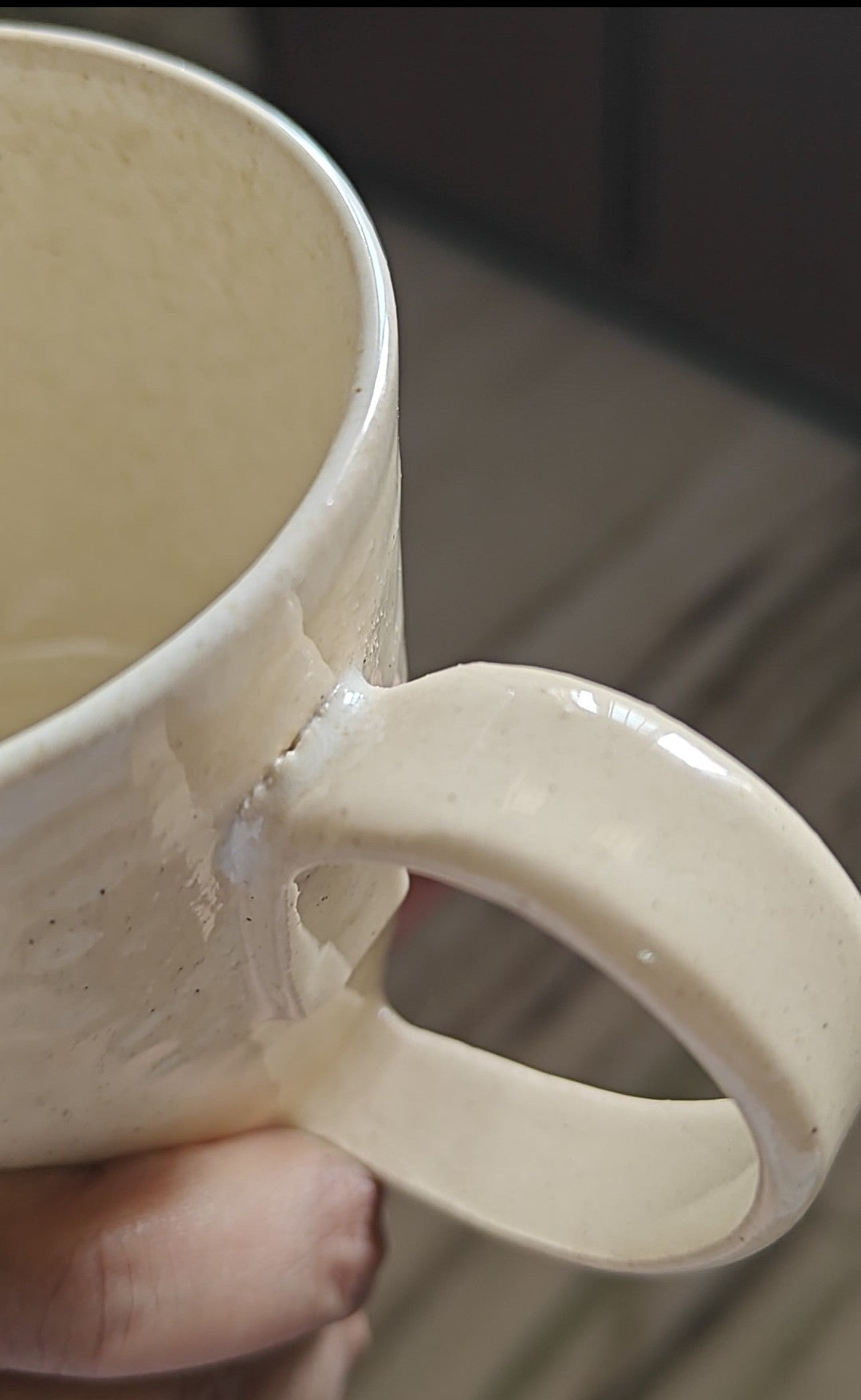 The imperfection here is the hair line crack around the handle joint which won't cause any trouble as the cracks have been sealed with glaze. This won't affect the function or durability of the mug in any way (Kindly slide to the last image for a clear picture)